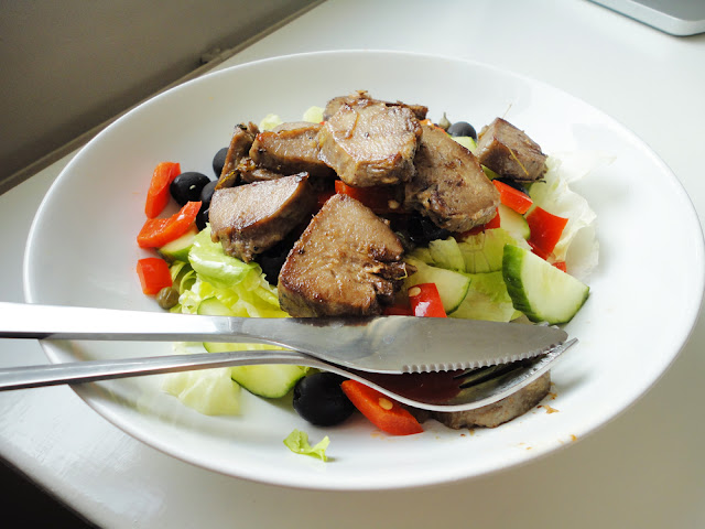 Salaattiin voi varmaanki laittaa mitä tykkää, mut meillä oli jäävuorisalaattia, kurkkia, kapriksia, mustia oliiveita ja pikasesti pannussa käytettyä paprikaa. Päälle valkosipulioljyy.
